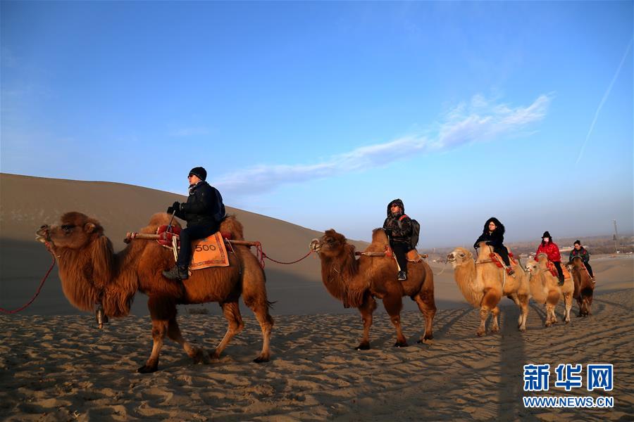 2019年1月1日,游客在甘肃省敦煌市鸣沙山月牙泉景区游览。