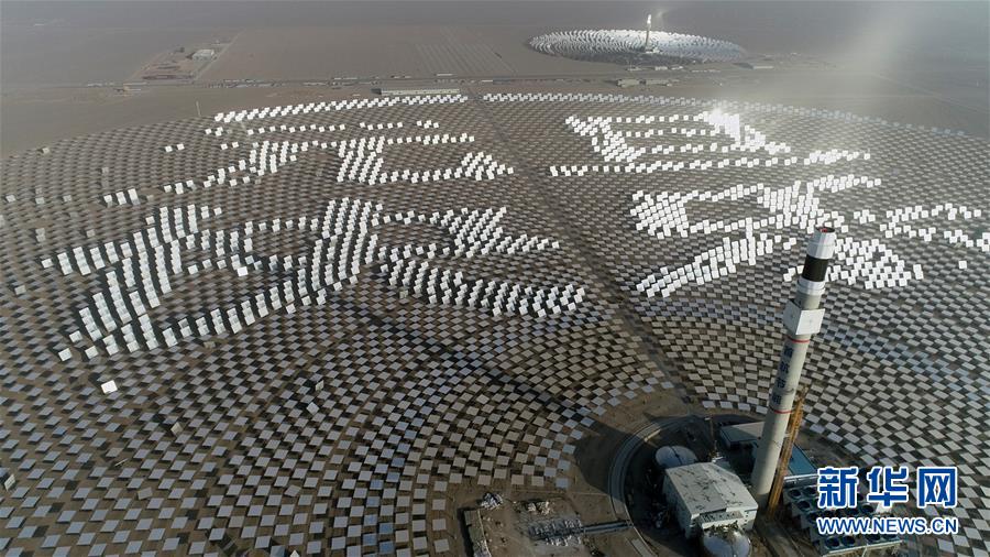 2019年1月1日,甘肃省敦煌市光电产业园区百兆瓦级熔盐塔式光热电站的定日镜拼成巨型文字“元旦快乐”。