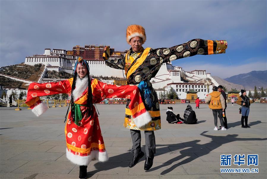 2019年1月1日,在西藏拉萨布达拉宫广场上,来自湖南的两名游客在拍照留影。