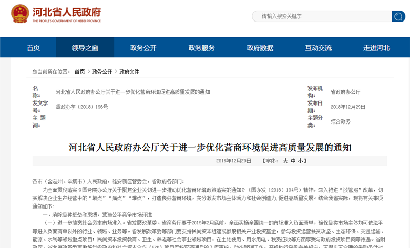 消除各种壁垒和束缚,营造公平竞争市场环境。通知要求,进一步放宽社会资本市场准入,河北省发改委、省商务厅要于2019年2月底前,全面实施全国统一的市场准入负面清单,确保各类市场主体均可依法平等进入负面清单以外的行业、领域等。着力解决融资难融资贵问题,人行石家庄中心支行要会同有关部门引导金融机构增加涉农、小微、民营企业贷款投放,重点支持民营企业票据和票面金额500万元及以下的小微企业票据办理再贴现。各地各有关部门要建立健全“政府承诺+社会监督+失信问责”机制,2019年底前梳理项目投资、政府采购等领域向企业承诺的事项清单,在政府门户网站公开并接受监督。