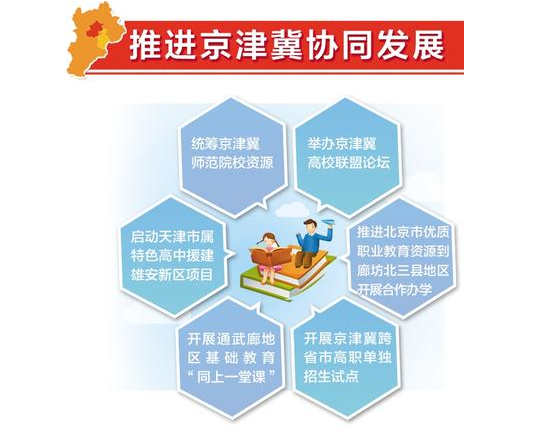 1月7日,京津冀教育协同发展工作推进会在雄安新区举行。会议明确提出,今年,京津冀三地教育部门将加强对接协作,通过统筹京津冀师范院校资源、启动天津市属特色高中援建雄安新区项目、开展通武廊地区基础教育“同上一堂课”、开展京津冀跨省市高职单独招生试点、推进北京市优质职业教育资源到廊坊北三县地区开展合作办学、举办京津冀高校联盟论坛等6项重点任务,进一步推动京津冀教育协同发展走向深入。