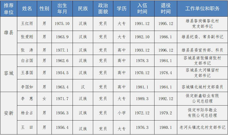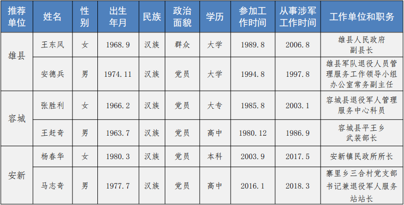 “河北雄安新区优秀退役军人”推荐人选基本情况汇总表