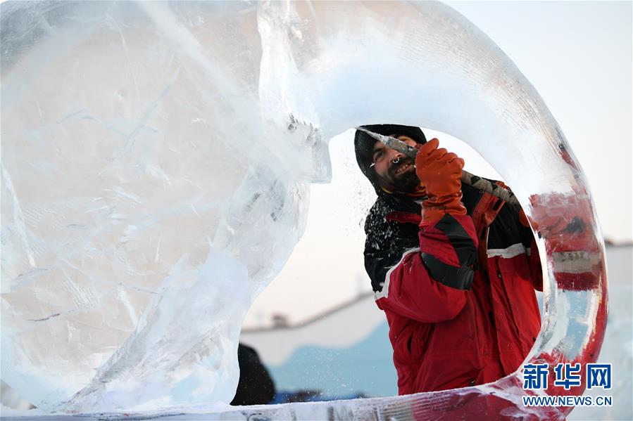 1月7日,参赛者在进行冰雕创作。 当日,在哈尔滨冰雪大世界园区进行的第三十三届中国哈尔滨国际冰雕比赛进入第二天,参赛的冰雕作品已初露芳容。新华社记者 王建威 摄