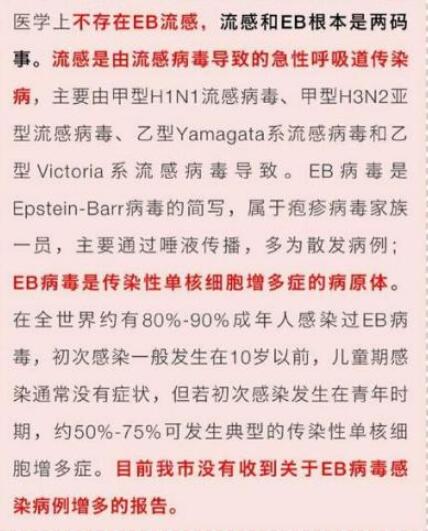 近日一条“这次的EB流感很严重”的言论在网络上引发热议,北京疾病预防控制中心官方微博5日发布消息称,医学上不存在EB流感,流感和EB根本是两码事。流感是由流感病毒导致的急性呼吸道传染病,EB病毒是传染性单核细胞增多症的病原体。目前北京市没有收到关于EB病毒感染病例增多的报告。