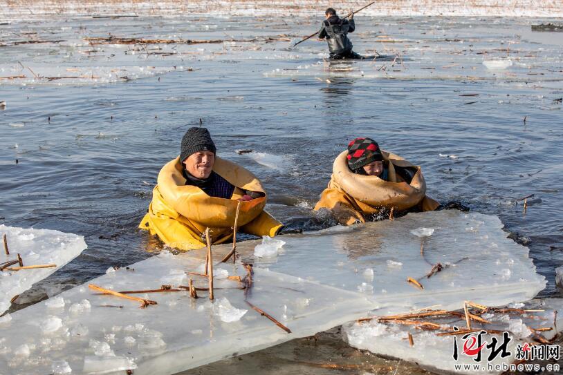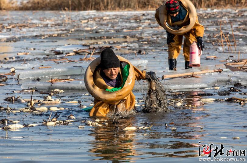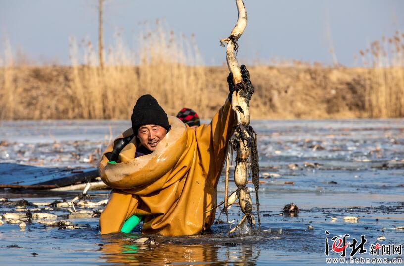 近日,在雄安新区安新县东向阳村的一处藕塘,采藕人正在破冰挖藕。