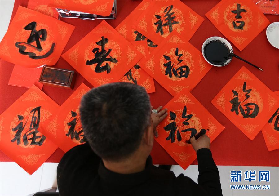 1月7日,书画爱好者在固安县林城村为村民写福字。当日,河北省固安县开展“福到万家”公益活动,组织书画爱好者免费为村民写春联、送福字、画年画,喜庆祥和迎春节。新华社发(门丛硕 摄)
