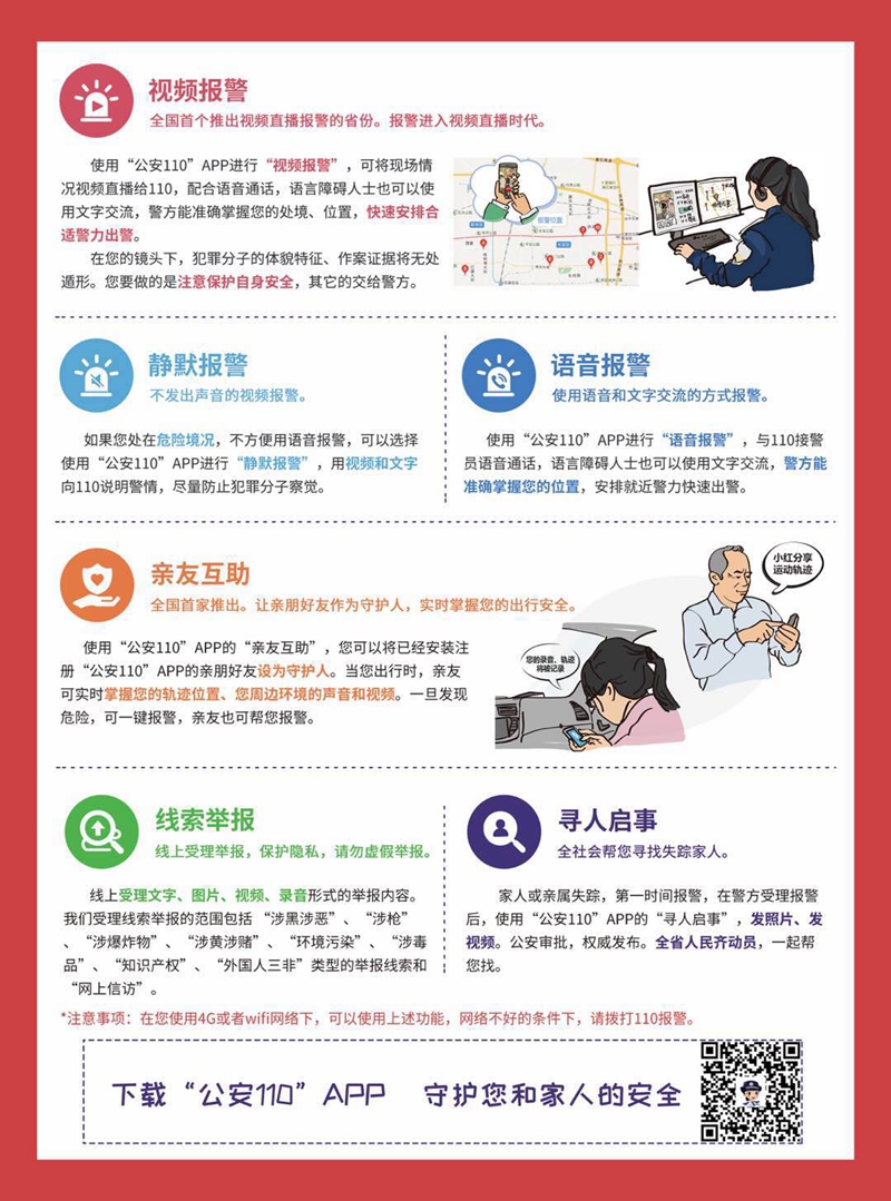 只要从安卓和苹果应用市场搜索“公安110”APP,或者扫描识别宣传图片的二维码,即可下载,在全省范围内使用。“公安110”APP的正式运行,将110报警从电话报警、短信报警,推向了视频报警时代。群众可以将现场情况准确直观地直播给公安机关,还可以帮助公安机关保存犯罪证据;同时还推出了“亲友互助”功能,在对出行安全不放心时,可以让亲朋好友实时查看出行人的轨迹位置、周边环境音视频,发现危险后一键报警,回应社会群众对出行安全的关切,具有极强的安全防范价值。同时,“公安110”APP还推出了线索举报、寻人启事、悬赏任务等功能,为群众提供了一个更加便捷、安全、参与度更高、用户体验更加良好警民积极参与、良性互动的报警服务平台。