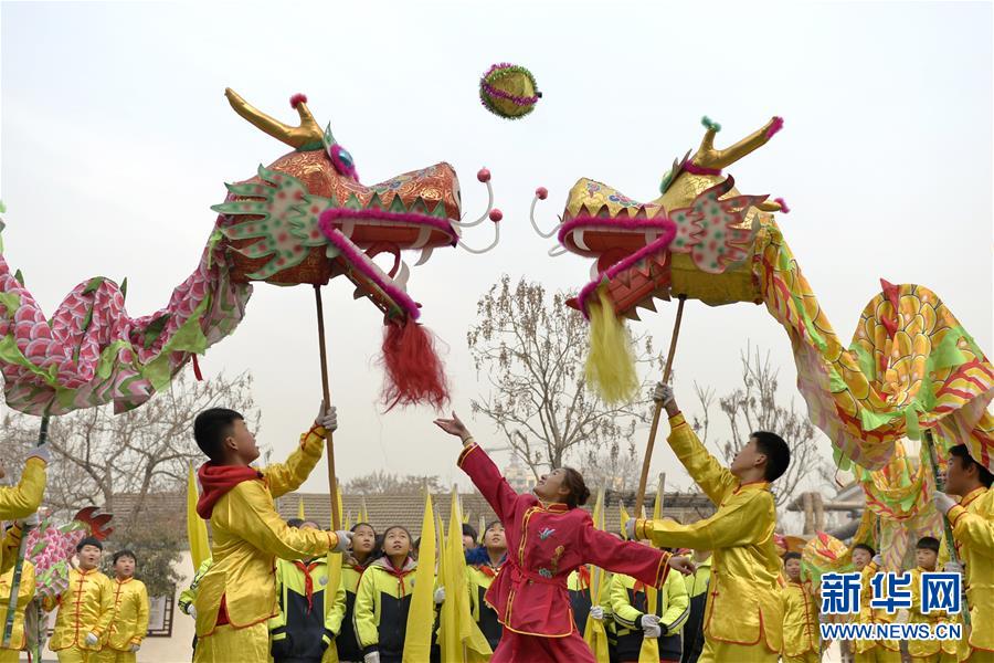1月8日,河北省邢台市东大街小学教师郭晓燕(中)指导学生学习“双龙戏珠”技法。近年来,邢台市东大街小学开展“传承传统文化 舞龙进校园”活动,把舞龙列入学校的传统文化课程,学生们在老师的指导下学习舞龙的扭、挥、跳、摇等技法,让孩子们体验舞龙的魅力,促进传统文化的保护和传承。新华社发(陈雷 摄)