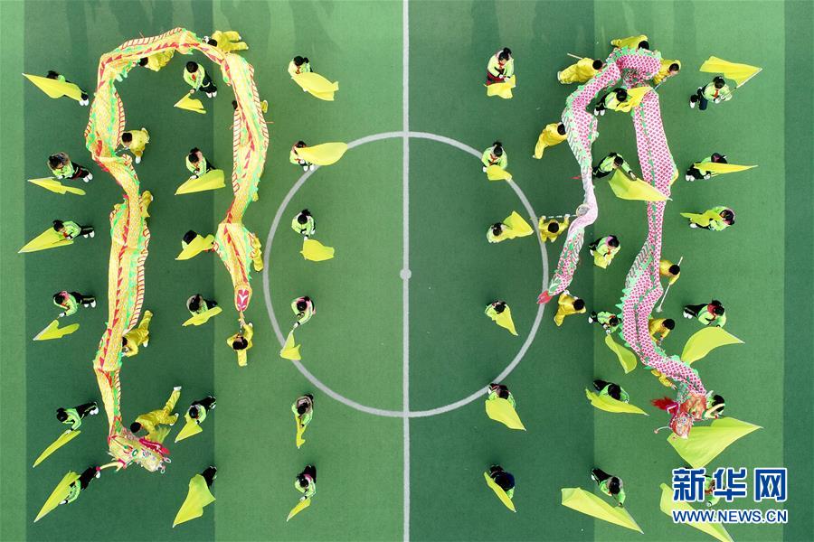 1月8日,河北省邢台市东大街小学学生在演练舞龙(无人机拍摄)。近年来,邢台市东大街小学开展“传承传统文化 舞龙进校园”活动,把舞龙列入学校的传统文化课程,学生们在老师的指导下学习舞龙的扭、挥、跳、摇等技法,让孩子们体验舞龙的魅力,促进传统文化的保护和传承。新华社发(陈雷 摄)