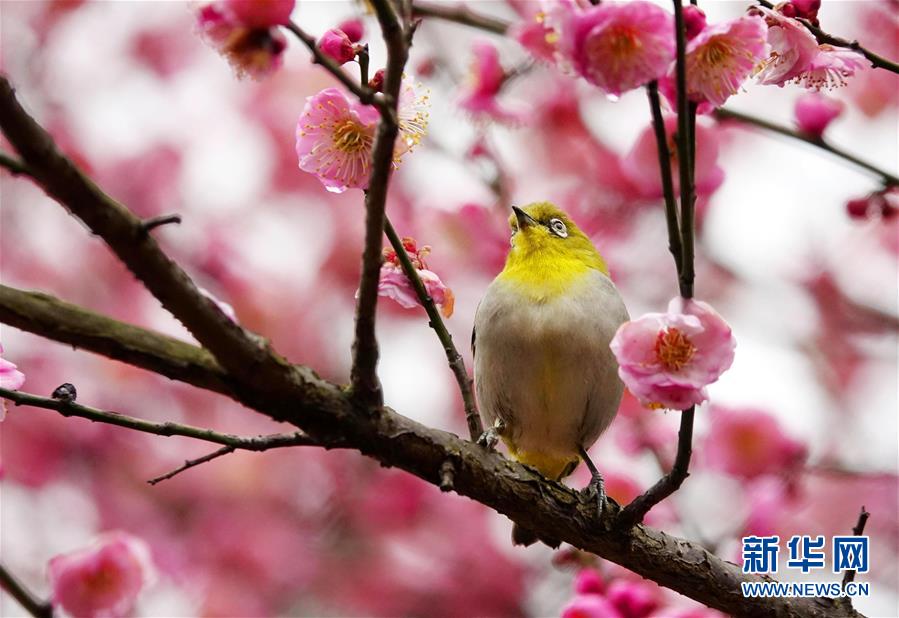 1月9日,在贵阳市南明河畔,一只小鸟被盛开的梅花吸引。新华社发(秦刚 摄)