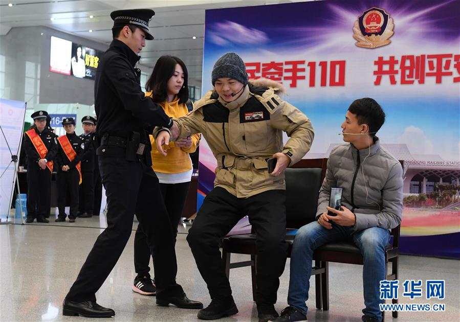 1月10日,在广西南宁东站,民警进行列车霸座处理情景演示。当日是全国第33个110宣传日,多地警方举办宣传活动。新华社记者 陆波岸 摄