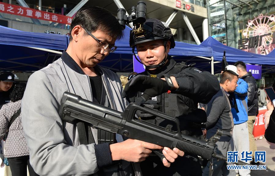 1月10日,在云南昆明,特警给市民讲解枪械知识。当日是全国第33个110宣传日,多地警方举办宣传活动。新华社记者 秦晴 摄
