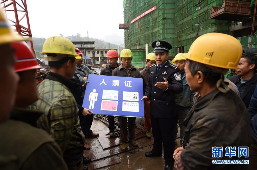 1月10日,重庆铁路公安处民警在建筑工地向工人讲解春运期间搭乘火车返乡的注意事项。当日是全国第33个110宣传日,多地警方举办宣传活动。新华社记者 唐奕 摄