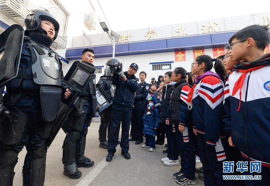 1月10日,河北省邯郸市滏东派出所民警向邯山区阳光实验小学学生讲解警用装备使用方法。当日是全国第33个110宣传日,多地警方举办宣传活动。新华社记者 王晓 摄