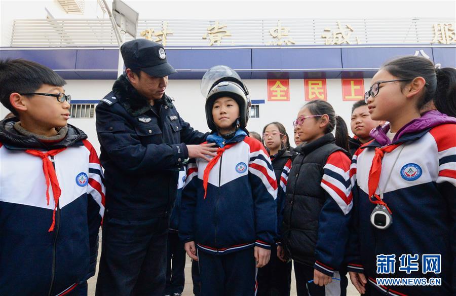 1月10日,河北省邯郸市邯山区阳光实验小学学生体验警用装备。当日是全国第33个110宣传日,多地警方举办宣传活动。新华社记者 王晓 摄