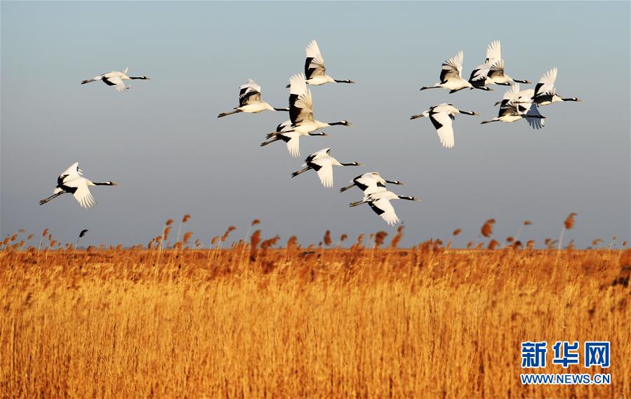 在黑龙江扎龙国家级自然保护区,一群人工繁育的丹顶鹤在空中飞翔(1月10日摄)。新华社记者王建威摄