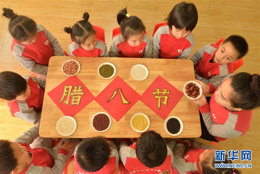 1月11日,河北省保定市望都县蓝天第二幼儿园的老师在给小朋友介绍腊八粥的食材。腊八节将至,各地学校、幼儿园开展“迎腊八”主题活动,小朋友们在老师的指导下了解腊八习俗,感受传统文化魅力。新华社发(陈卫红 摄)