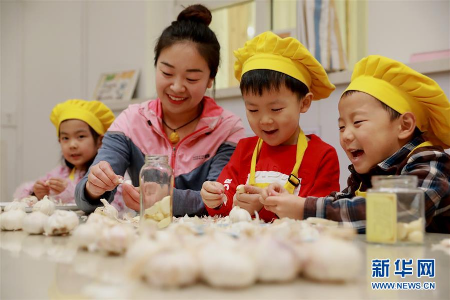 1月11日,在河北石家庄市第一幼儿园,老师和孩子们在剥蒜准备腌制腊八蒜。腊八节将至,各地学校、幼儿园开展“迎腊八”主题活动,小朋友们在老师的指导下了解腊八习俗,感受传统文化魅力。新华社发(梁子栋 摄)
