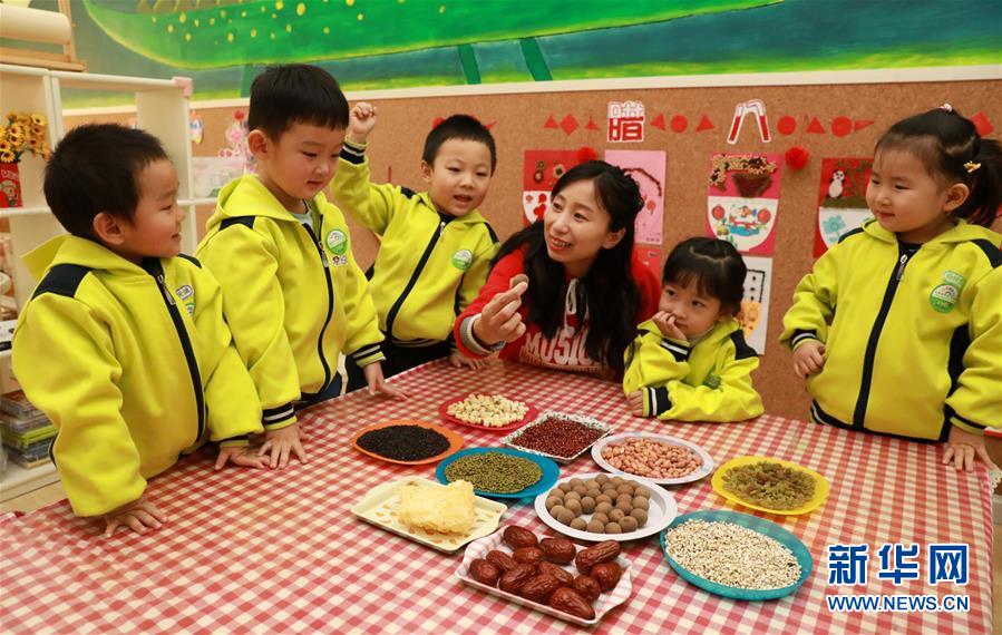 1月11日,在河北石家庄市第一幼儿园,老师教孩子们认识制作腊八粥的食材。腊八节将至,各地学校、幼儿园开展“迎腊八”主题活动,小朋友们在老师的指导下了解腊八习俗,感受传统文化魅力。新华社发(梁子栋 摄)