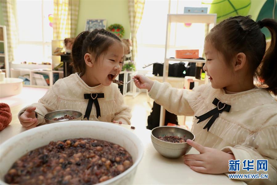 1月11日,在河北石家庄市第一幼儿园,一对双胞胎姐妹在喝腊八粥。腊八节将至,各地学校、幼儿园开展“迎腊八”主题活动,小朋友们在老师的指导下了解腊八习俗,感受传统文化魅力。新华社发(梁子栋 摄)