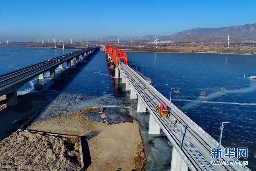 当日,京张高铁官厅水库特大桥铺轨工作完成。京张高铁全长174公里,是2022年北京冬奥会的重要交通保障线。