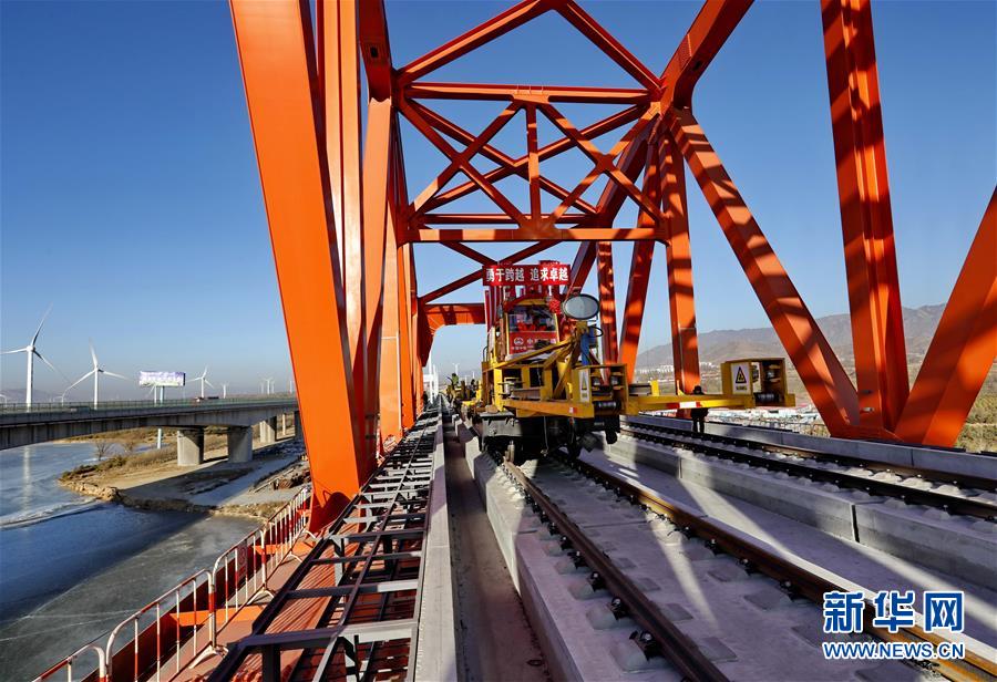 1月13日,中铁三局的工人在京张高铁官厅水库特大桥进行铺轨作业。新华社记者 杨世尧 摄