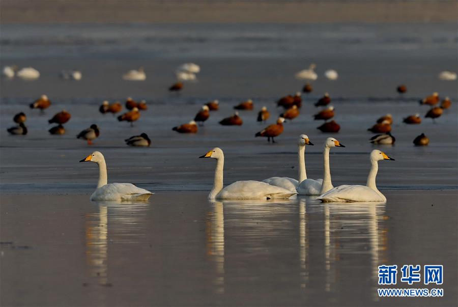 1月13日,天鹅等水鸟在张家口市宣化区洋河水库休憩。近年来,河北省张家口市宣化区立足京津冀生态涵养区的功能定位,不断加大环境治理和生态功能修复力度,使洋河水库及周边湿地成为天鹅、大雁、野鸭、灰鹤等多种鸟类南北迁徙中的栖息地。新华社记者杨世尧摄