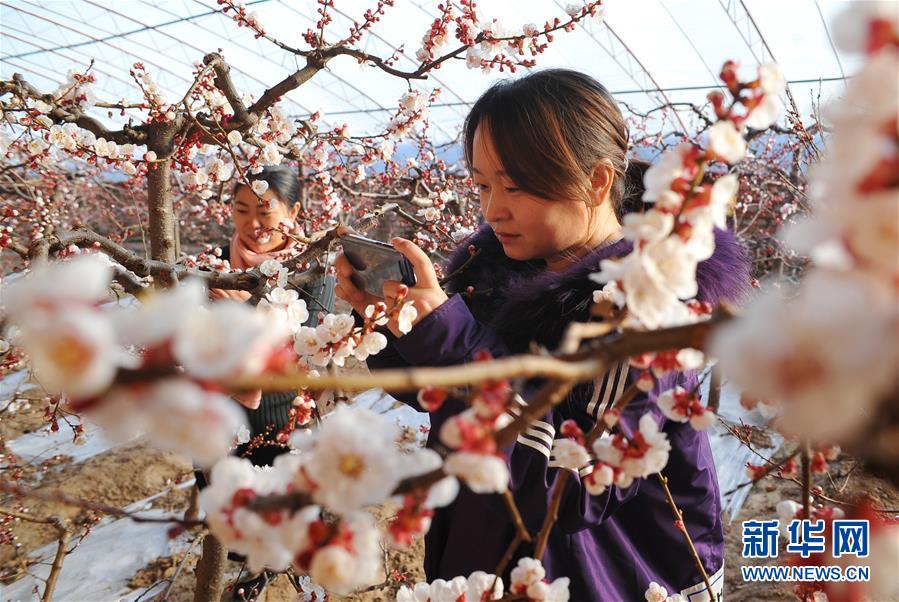 数九寒天,河北省张家口市宣化区洋河南镇的种植基地大棚春意融融,杏花绽放,吸引游客前来观赏。新华社发(陈晓东 摄)
