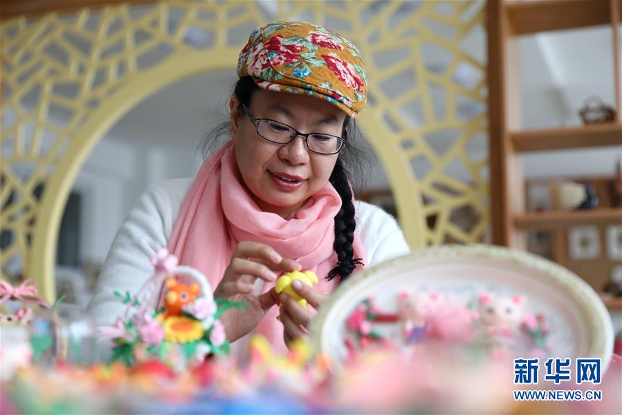 春节临近,荣成市民间艺人姜雪洁忙着制作“百猪闹春”系列粘土捏塑作品,准备在当地的文化产品展览中心展示。新华社发(林海珍 摄)