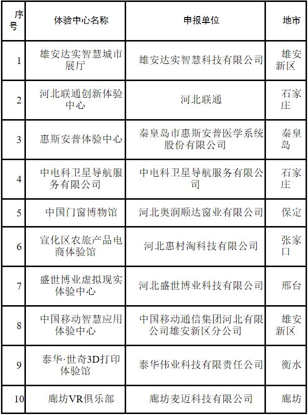按照省“大智移云”发展领导小组办公室印发的《关于组织申报河北省第一批信息消费体验中心的通知》(冀大智移云办〔2018〕4号)要求,通过各市工信部门筛选上报、专家评审、厅务会研究等规定程序后,拟认定10个河北省第一批信息消费体验中心。现将有关情况进行公示,请社会各界对项目及承担单位真实性进行监督。有关意见、建议请于2019年1月23日17:00前以书面形式告知我办。