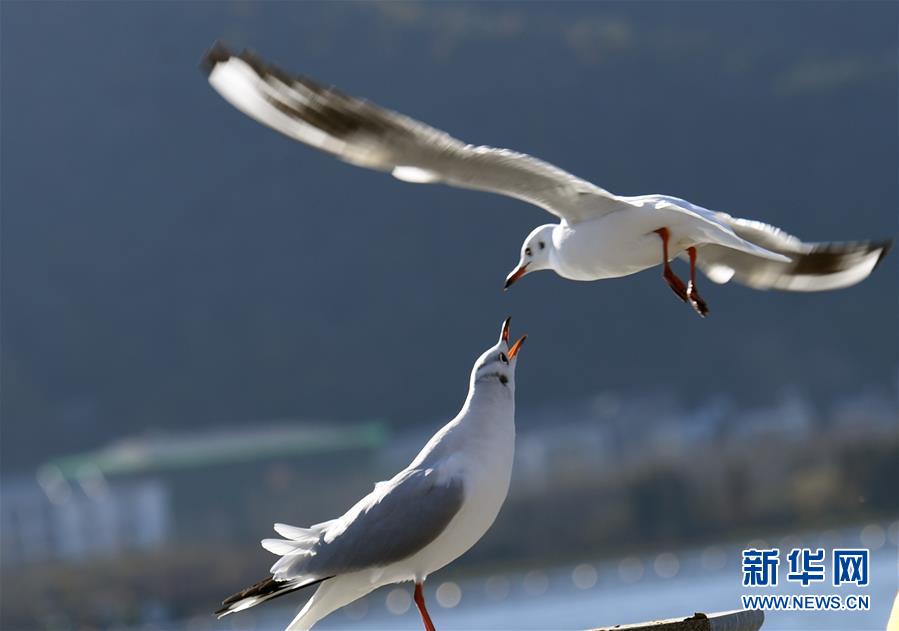 两只红嘴鸥在昆明滇池海埂大坝嬉戏(1月11日摄)。入冬以来,数万只红嘴鸥飞临云南昆明翠湖公园、滇池海埂大坝等地,成为城市一道亮丽的风景。新华社记者杨宗友摄