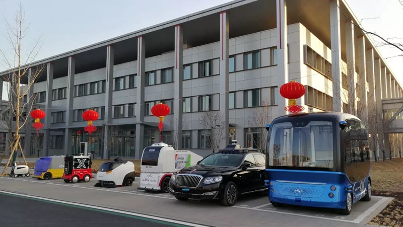 △“无人神器”们一字排开,从左到右分别是:无人送餐车、无人配送车、无人物流车、无人清扫车、无人快递车、无人驾驶电动汽车、无人驾驶公交车。(央视记者王晓东拍摄)
