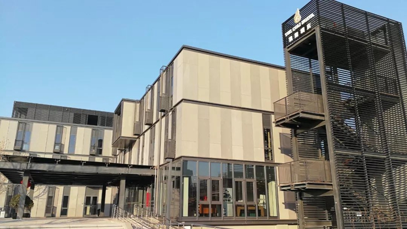 △这栋装配式建筑是一座酒店。它的每一个房间都是一个提前装配好的大盒子,包括盒子里的家具和电器。整个酒店的68个房间就相当于68个盒子。(央视记者王晓东拍摄)
