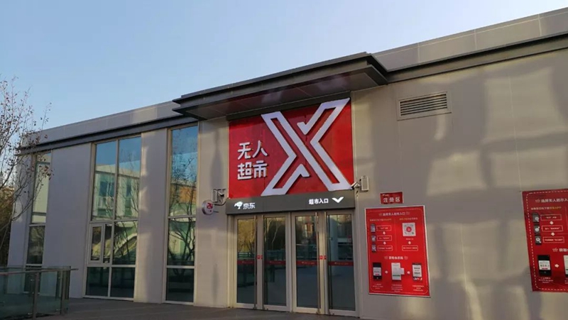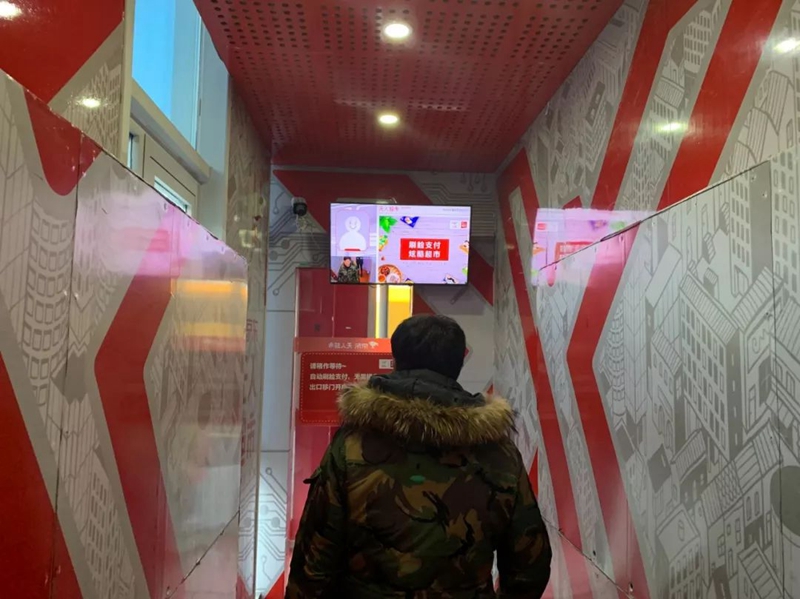△市民在入口处通过摄像头进行人脸识别,刷脸绑定支付信息就可以进入超市购物。选定完商品后,在出门处,通过芯片智能识别就可以自动完成结算。(央视记者卢心雨拍摄)