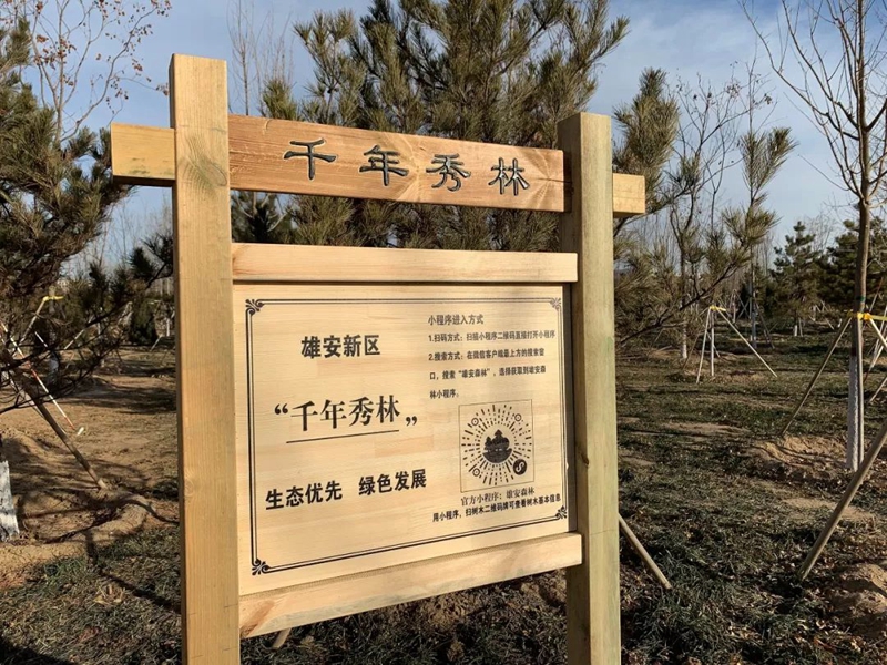 △您可以试试用微信扫描指示牌上的二维码进入小程序“雄安森林”,之后在小程序中扫描ACX7586这棵树的二维码,来看看它的“身份信息”。(央视记者张淳拍摄)