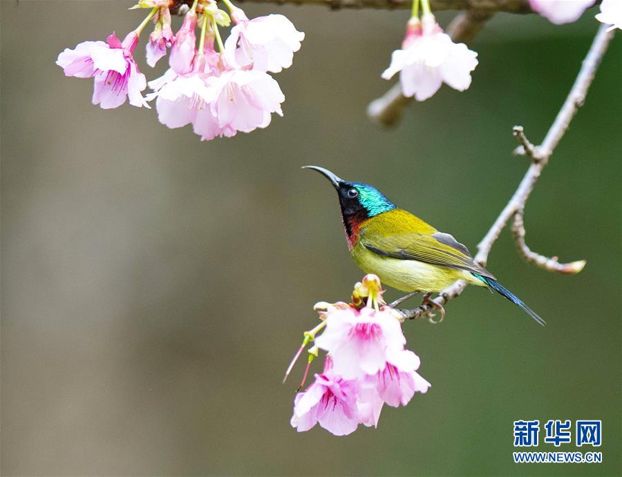福建省福州国家森林公园内,一只叉尾太阳鸟在盛开的樱花枝头休憩(1月17日摄)。入冬以来,福建省福州市各大公园渐次绽放的樱花,吸引了大批叉尾太阳鸟前来采蜜休憩。新华社记者梅永存摄