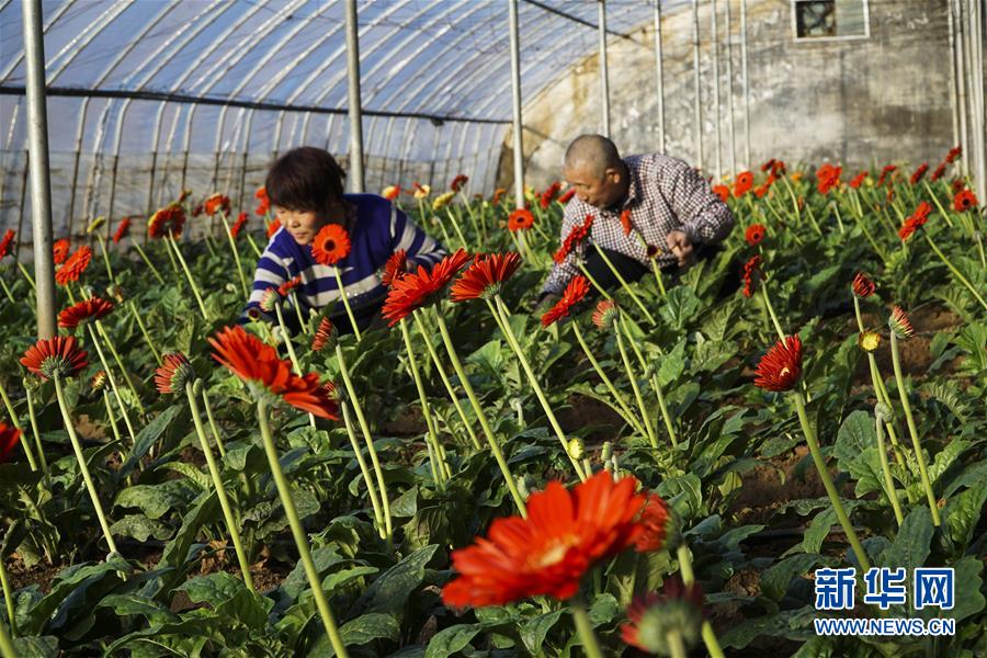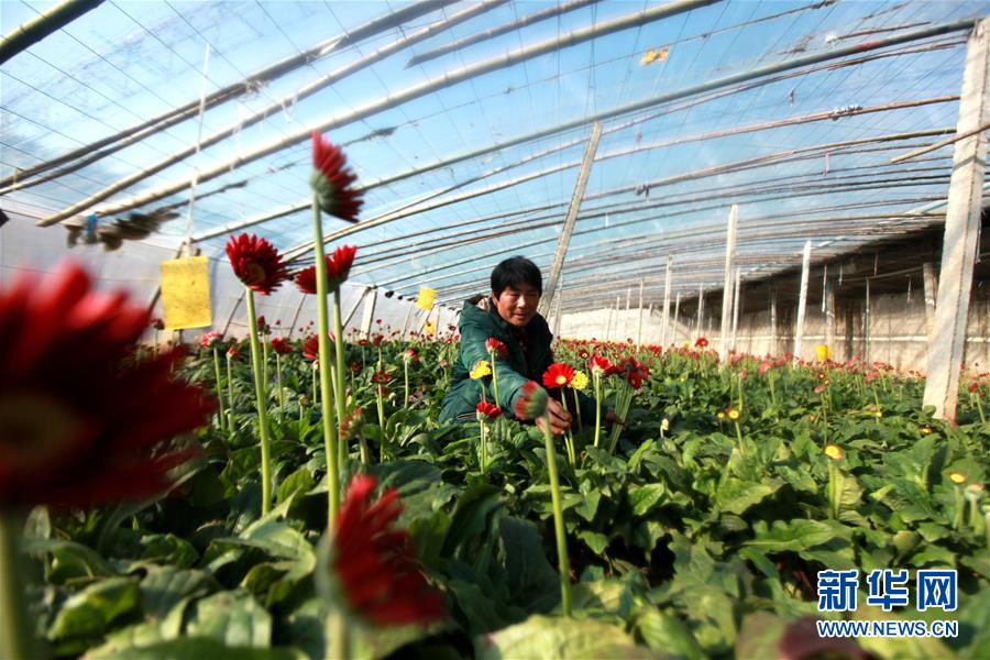 1月17日,在山东省临沂市平邑县利沟村,种植户在大棚里采摘花卉。春节临近,各地花卉种植大棚、花卉销售市场内一片姹紫嫣红,洋溢着浓浓的年味。新华社发(武纪全 摄)