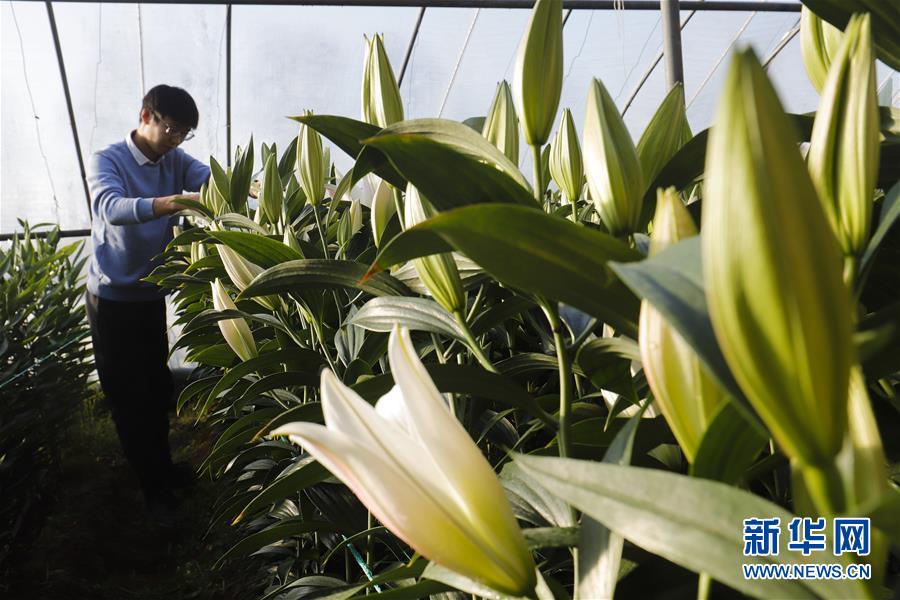 1月17日,河北省遵化市兴旺寨乡何家峪村农民在大棚内管护百合花。春节临近,各地花卉种植大棚、花卉销售市场内一片姹紫嫣红,洋溢着浓浓的年味。新华社发(刘满仓 摄)