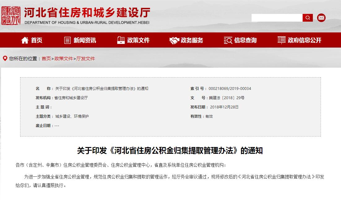 近日,从河北省住建厅获悉,为进一步加强全省住房公积金管理,规范住房公积金归集和提取的管理运作,《河北省住房公积金归集提取管理办法》修改版印发,提出单位应当自设立之日起30日内,持单位依法设立的证明文件、职工个人信息等资料到单位所在地管理中心办理住房公积金缴存登记;单位新录用或者异地新调入职工的,应当自录用或者调入职工之日起30日内,到单位所在地管理中心办理缴存登记;灵活就业人员持身份与居住证件等资料,到当地管理中心办理账户设立手续。该办法自2019年4月1日起施行。