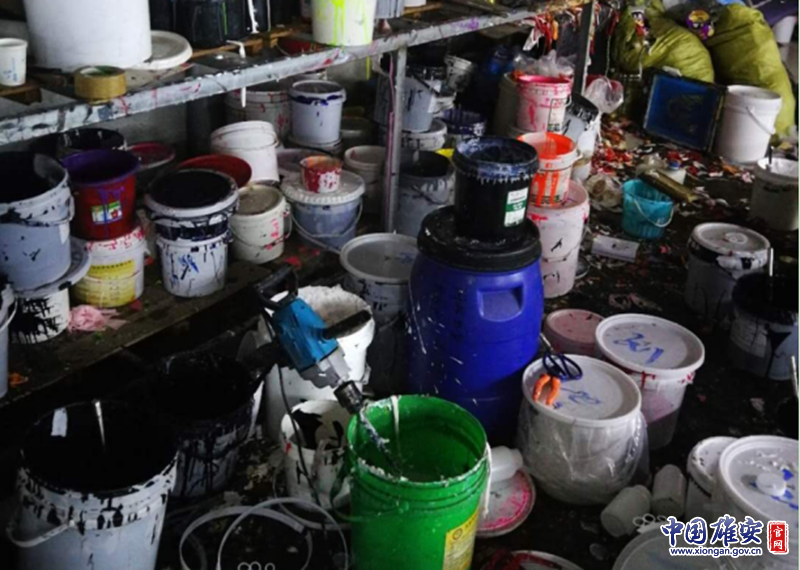 现场堆存的大量油墨桶。雄安新区生态环境局供图