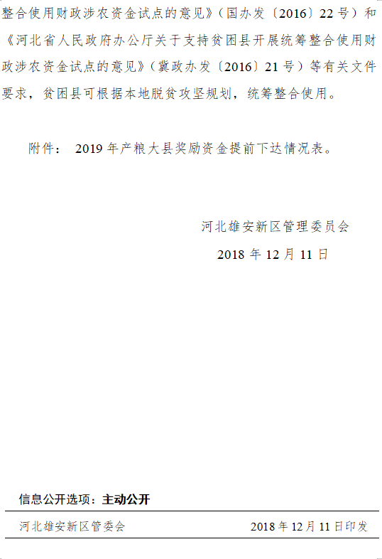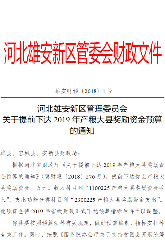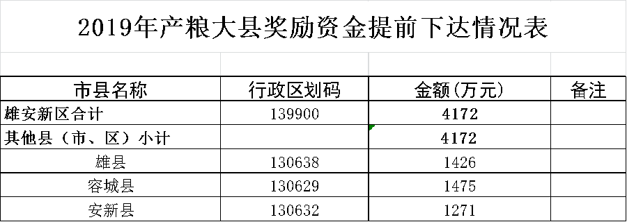 现将雄安新区提前下达2019年产粮大县奖励资金预算资金分配结果予以公告,如有异议,请向以下部门提出意见。