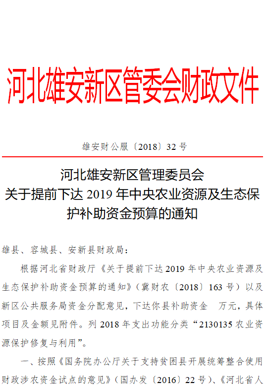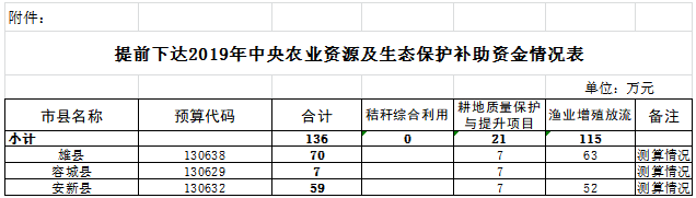 现将雄安新区提前下达2019年中央农业资源及生态保护补助资金预算资金分配结果予以公告,如有异议,请向以下部门提出意见。