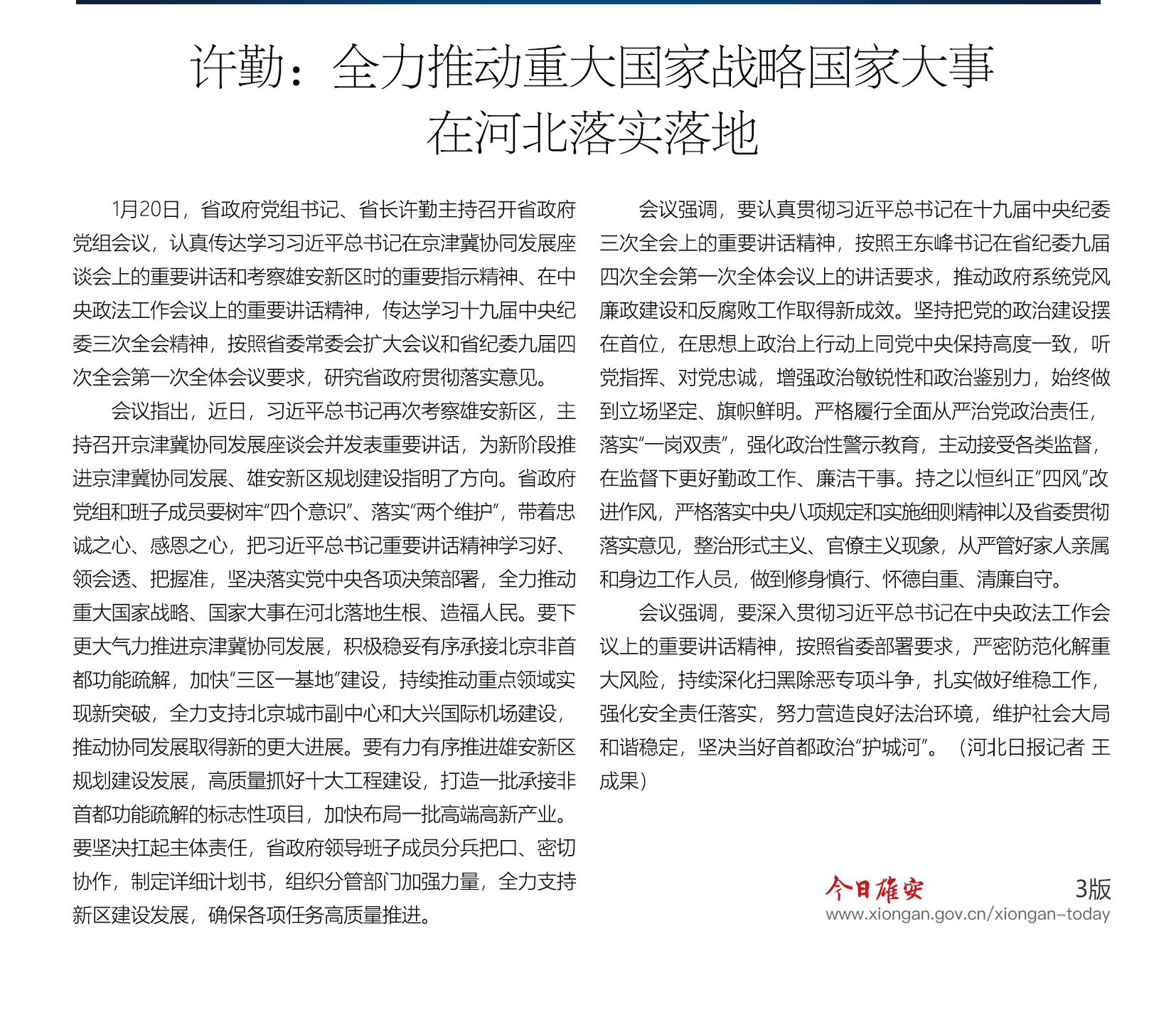 1月20日,河北省政府党组书记、省长许勤主持召开省政府党组会议。