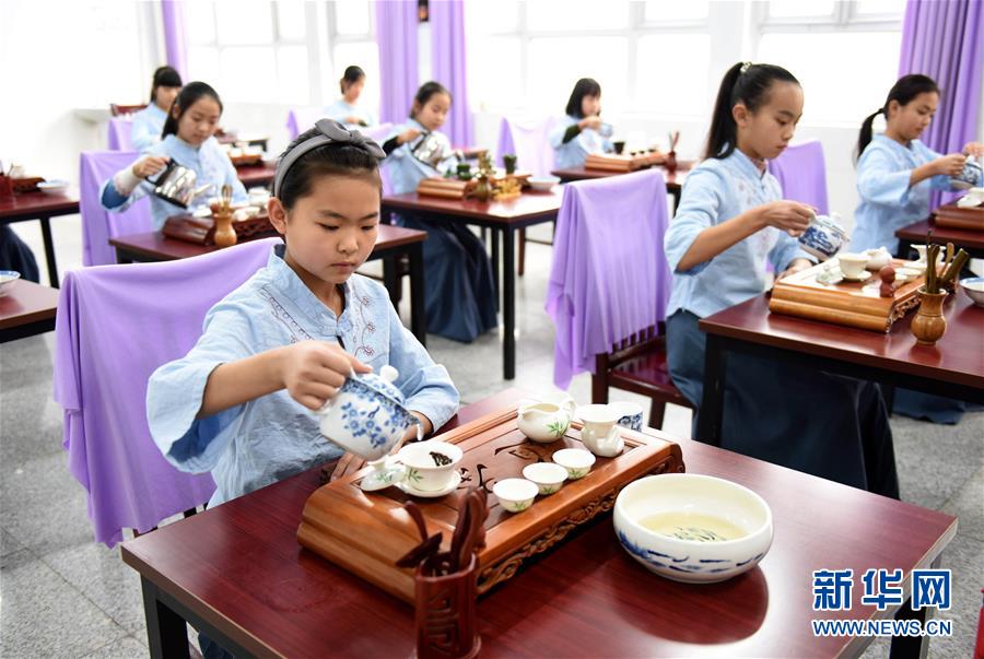 1月22日,南和县新区小学学生在参加茶艺特色班。