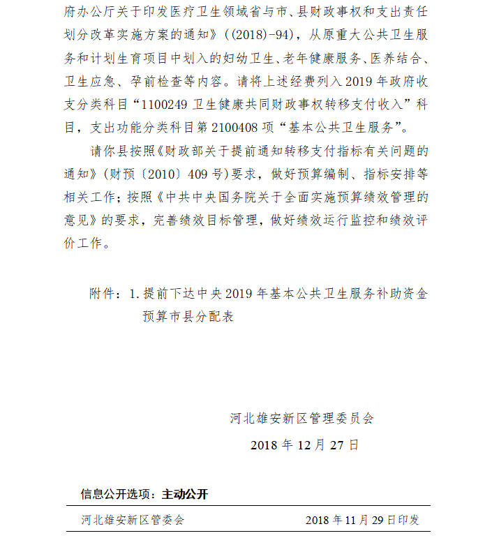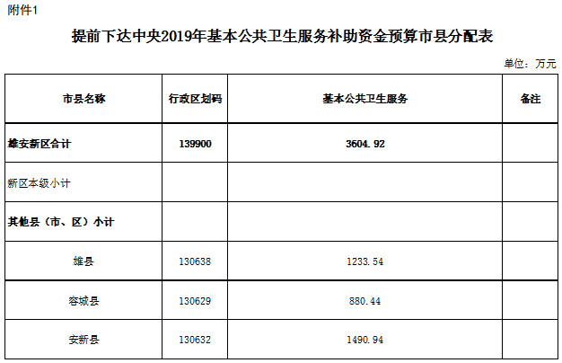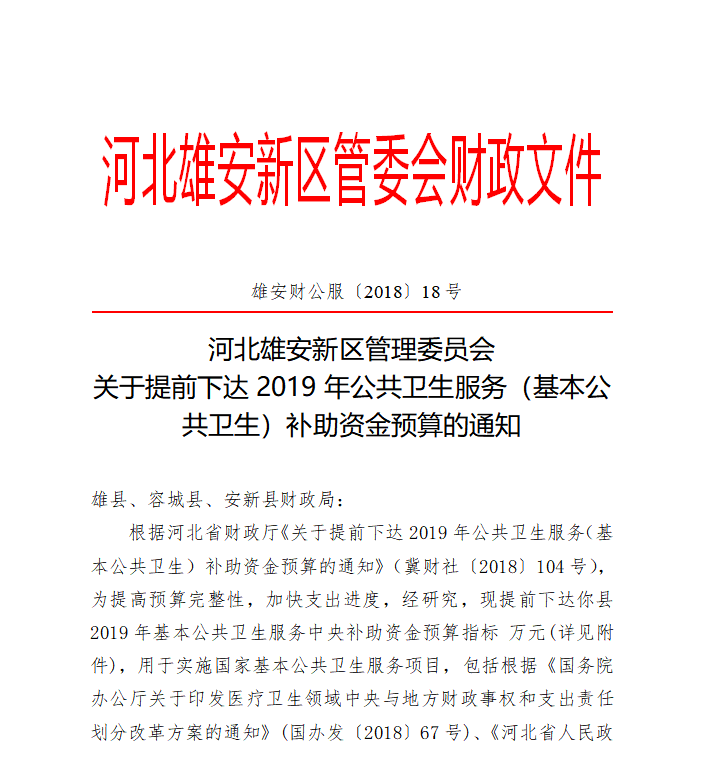 现将雄安新区提前下达2019年公共卫生服务(基本公共卫生)补助资金预算资金分配结果予以公告,如有异议,请向以下部门提出意见。