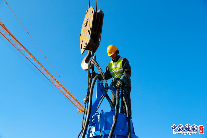 现场施工人员在为水泵吊装做准备。中国雄安官网记者王京卓 摄