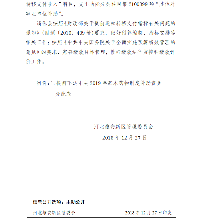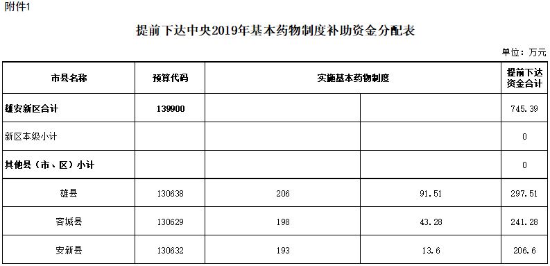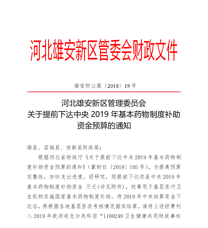 现将雄安新区提前下达中央2019年基本药物制度补助资金预算资金分配结果予以公告,如有异议,请向以下部门提出意见。