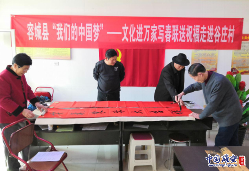中国雄安官网1月23日电 2019年春节临近,为营造喜庆祥和的节日氛围、弘扬优秀传统文化、助力新区规划建设,中共容城县委宣传部、容城县文联开展以“我们的中国梦”为主题的写春联、送祝福活动,组织书法家们深入乡村、社区为群众义务写春联,用笔墨传递温情、营造浓浓年味。