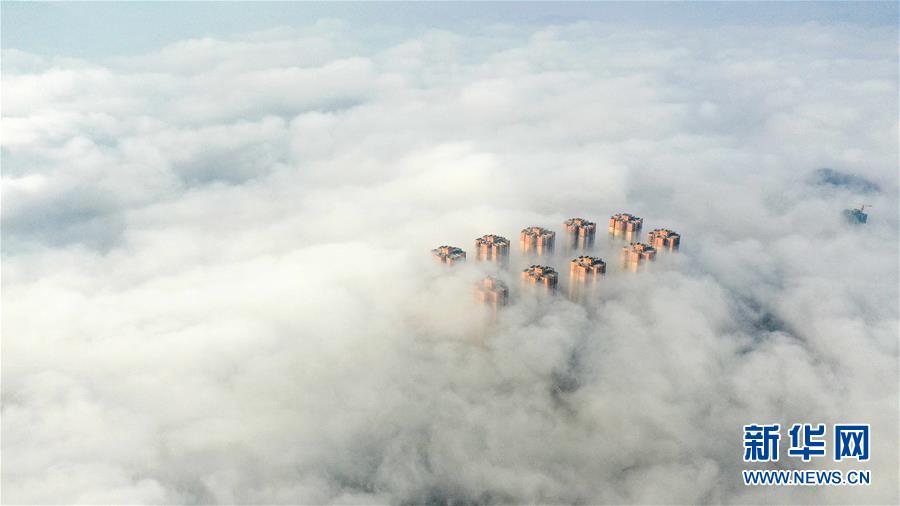 当日,铜仁市万山区上空出现平流雾景观,建筑物、山峦在雾气中若隐若现。新华社发(伍卫东 摄)