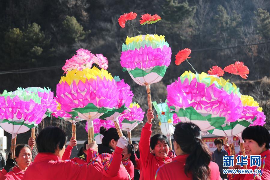 1月23日,在承德市营子区寿王坟镇南沟村,村民在排练灯会。新春佳节临近,河北省承德市营子区寿王坟镇南沟村的村民忙着赶制花灯、排练灯会,为迎春灯会表演做准备。新华社发(刘环宇 摄)